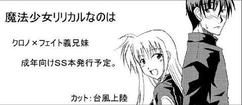 トップに冬の新刊ハラオウン義兄妹本『ボクのいもうと RE:MIX!』表紙のフェイトとクロノ。とっても皮いらしいフェイトさんが特徴的で、買いにいけないのが悔しいです正直。